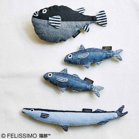 デニムで作ったペットのおもちゃの第3弾、大小いろいろなお魚です。