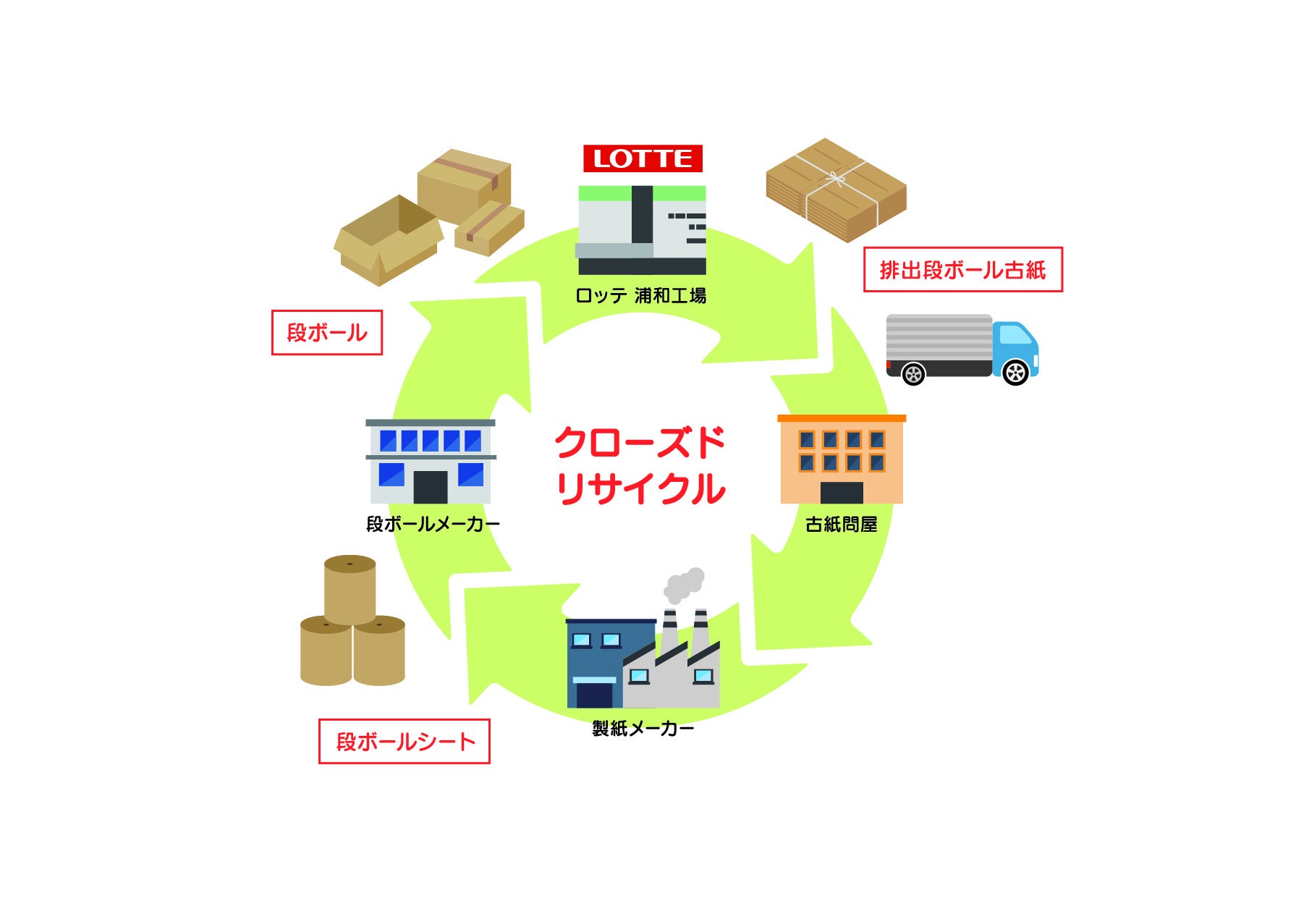 注1 マスバランス方式によるクローズドリサイクル。マスバランス方式とは、ある特性を持った原料(この取り組みでは、ロッテ工場より排出した古紙)がそうでない原料(一般に回収された古紙)と混合される場合に、原料の投入量に応じて、製品の一部に対してその特性を割り当てる手法のこと。