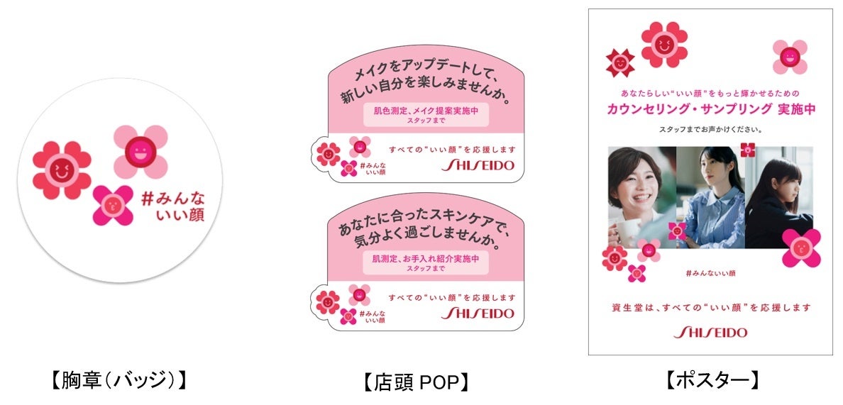 「みんな、いい顔してる。」メッセージと店頭活動を連携させるアイコンを作成し、一人ひとりのお客さまに合わせたパーソナルな提案を実践するパーソナルビューティーパートナーの胸章(バッジ)や、店頭POPやポスターなど店頭活動ツールなどに活用します。アイコンは、『「いい顔」は顔にパッと花が咲いたような表情のはず。その「いい顔」で日常を美しくする』というコンセプトで作られています。