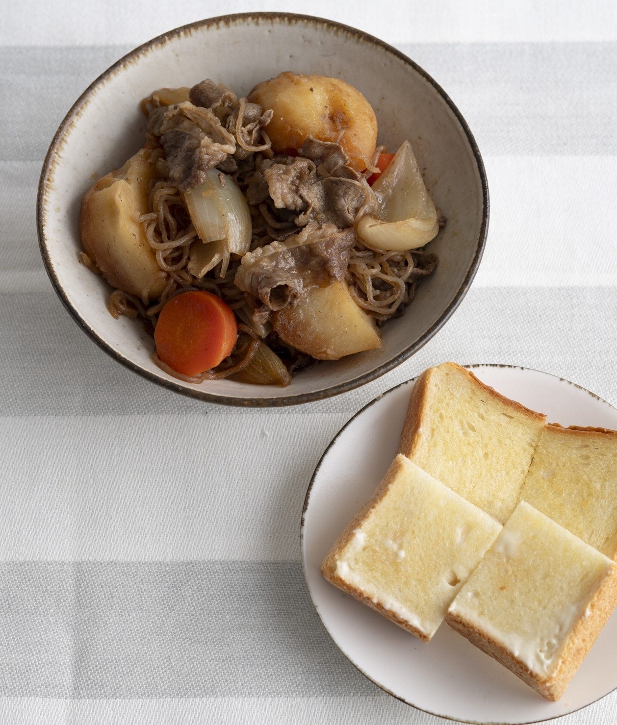 本書に登場する「フライパン肉じゃが」は仕上げにバターを加えるのがポイント。軽くトーストしてバターをたっぷり塗ったパン・ド・ミ(食パン)に、つぶしたじゃがいもをのせるのがおすすめの食べ方。