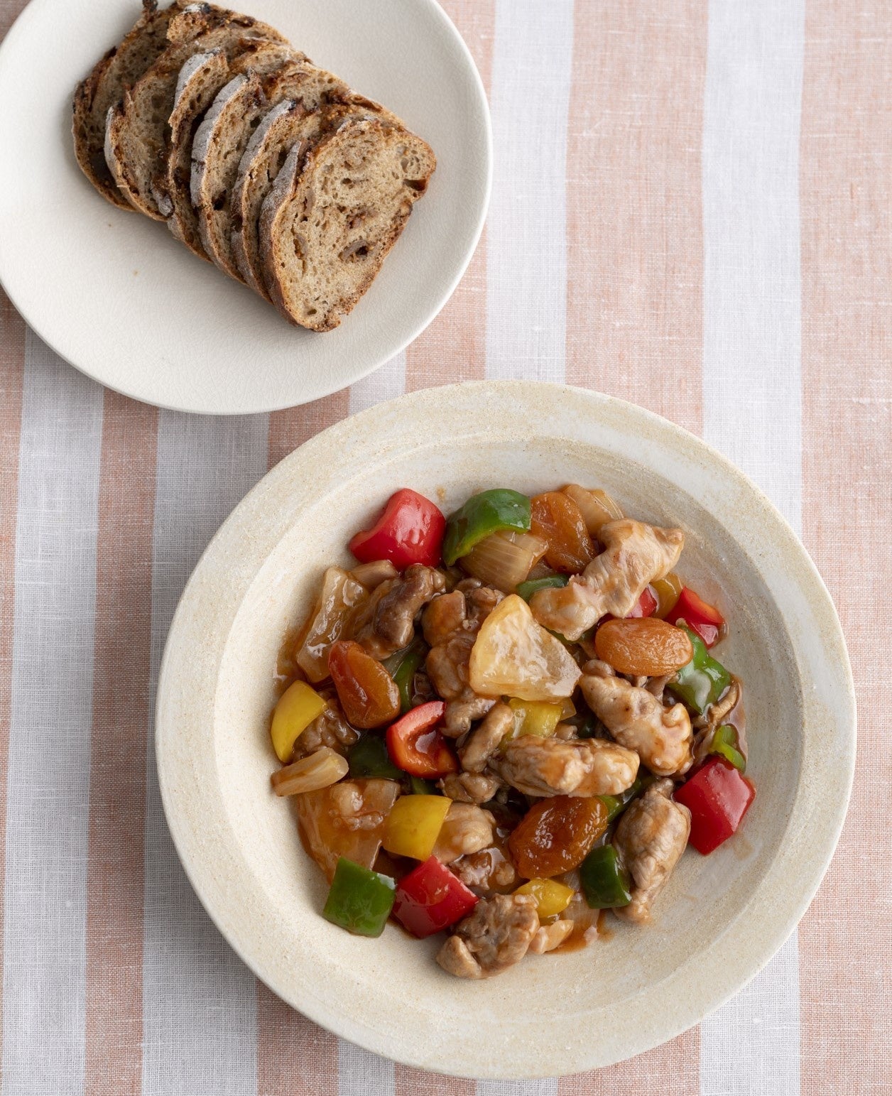「薄切り豚肉とドライフルーツの酢豚」は、いつもの酢豚にドライのパイナップルとアプリコットを追加。合わせるパンもドライフルーツ入りを選び、酸味と甘みのハーモニーを楽しみます。