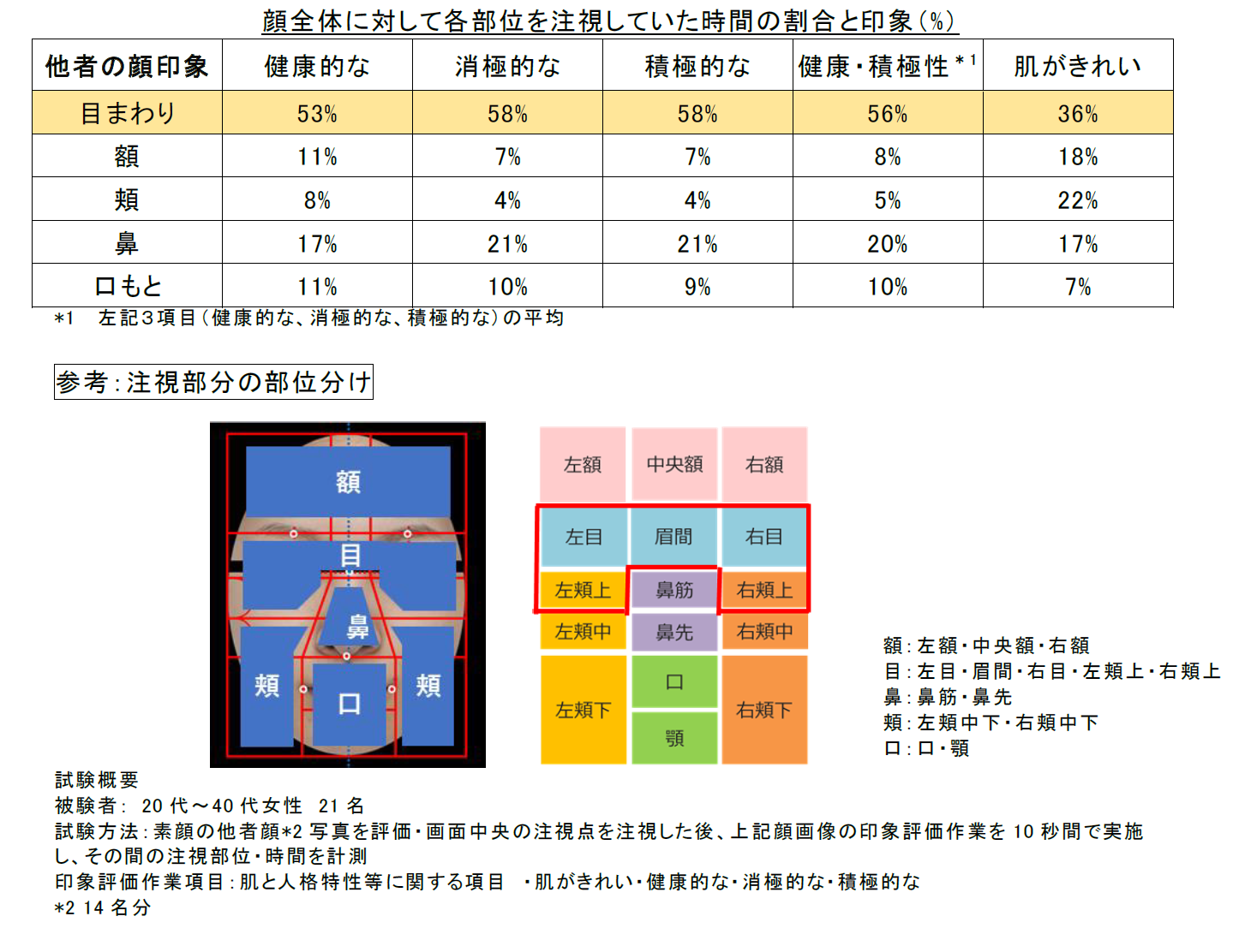 資生堂は、他者の印象を評価する際に、顔のどの部位を見ているのか、顔全体に対する各部位の注視時間を計測することで検証をおこないました。その結果、健康的で積極的な印象、肌のきれいさなどの各印象を判断する際に、目まわりを最も注視していることを確認しました。