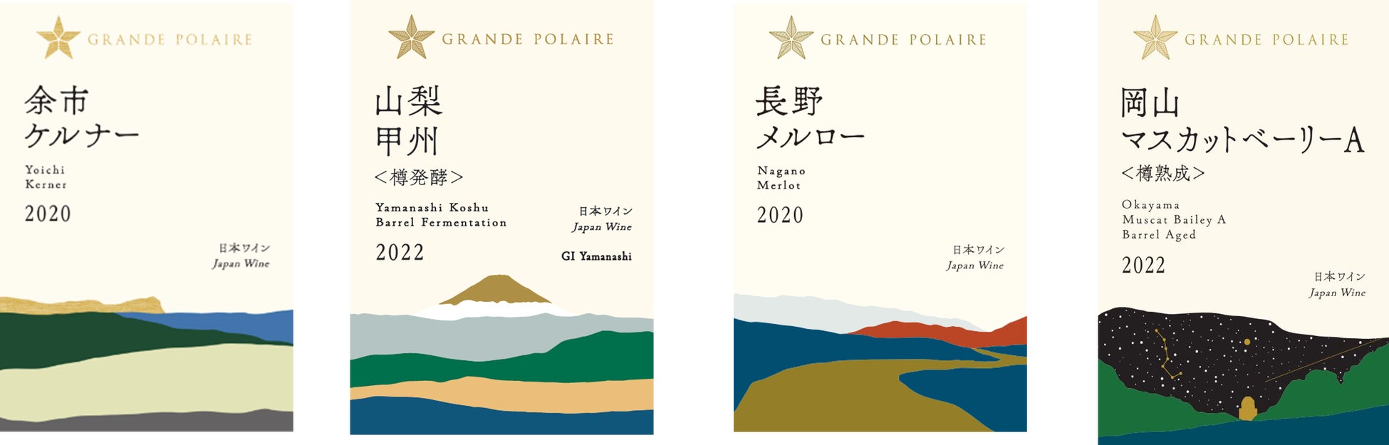 リニューアル第1弾では、シングルヴィンヤードシリーズのデザインリニューアルを行いました(注1)が、今回はその第2弾として、グランポレールの産地・品種・生産者の個性が際立つキャラクターシリーズのラベルデザインを大幅に刷新します。新コンセプトに合わせ、産地の違いが一目でわかるデザインに変更し、グランポレールを生み出す4つの産地「北海道」「長野」「山梨」「岡山」それぞれから臨む雄大な自然の風景を描きました。