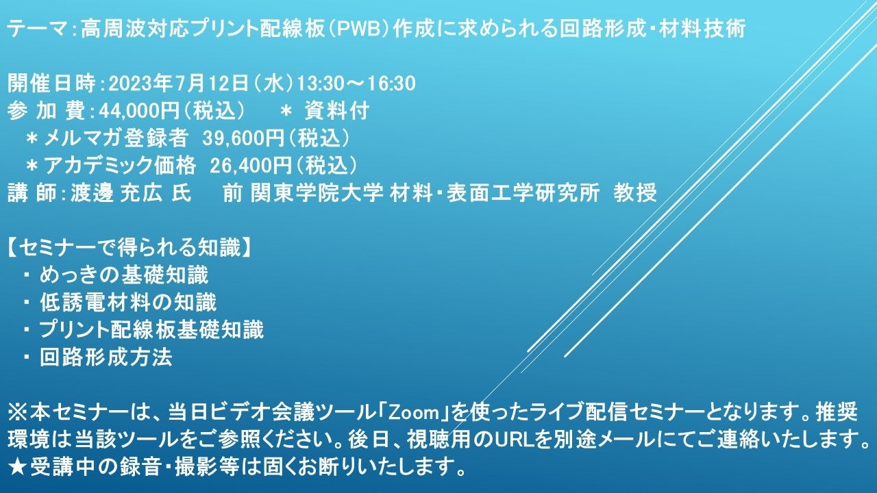 【ライブ配信セミナー】高周波対応プリント配線板(PWB)作成に求められる回路形成・材料技術 7月12日(水)開催 主催:(株)シーエムシー・リサーチ