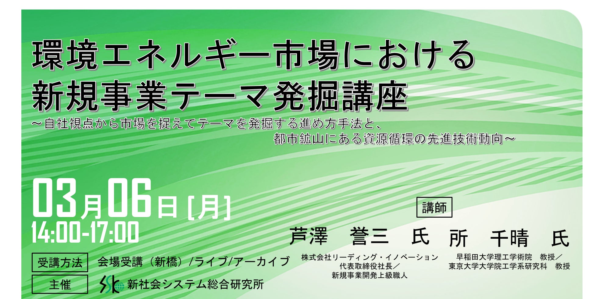 「環境エネルギー市場における新事業テーマ発掘」と題して、(株)リーディング・イノベーション 芦澤 誉三氏、早稲田大学理工学術院 所 千晴 氏によるセミナーを2023年3月6日(月)に開催!!