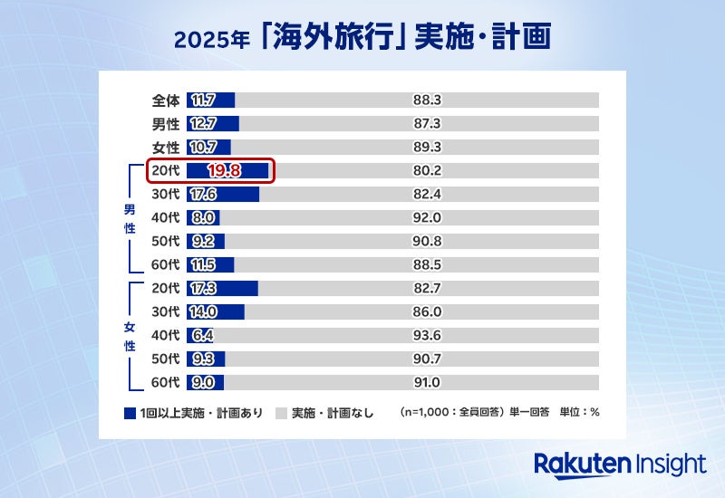 楽天インサイト株式会社(以下「楽天インサイト」)は、「旅行に関する調査」をインターネットで実施しました。今回の調査は、2025年3月14日(金)から3月18日(火)の5日間、「楽天インサイト」に登録しているモニター(約220万人)の中から、全国の20~69歳の男女1,000人を対象に行いました。本調査では、2025年の旅行実績や計画、予算についてなどを調査しました。