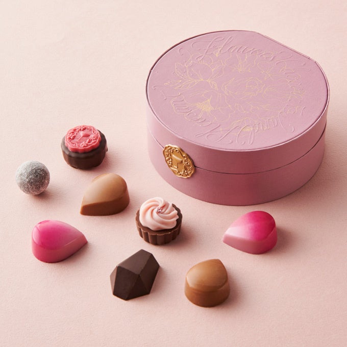 こころを満たす、「花」と「酒」と「チョコレート」。ピンクの花に赤い果実、赤ワイン。スイートな乙女の世界で、自分をとびきり甘やかしたい時にぴったりなひと箱です。ローズやスイートピーのフラワーカクテルをイメージした華やかな味わいと、キルシュや甘口の赤ワイン、あまおう苺など、さまざまなチョコレートを詰め合わせました。