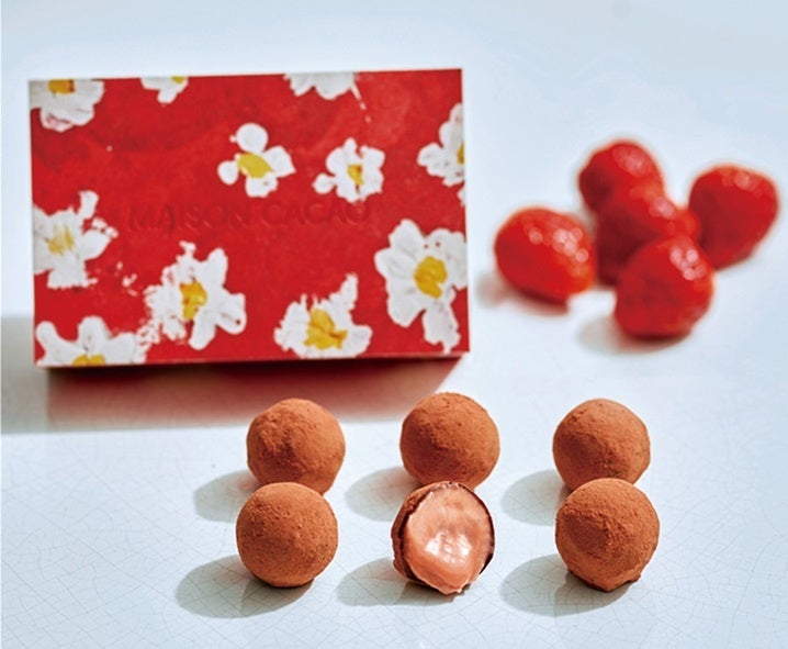 とろける口どけが楽しめるブランドの代名詞「アロマ生チョコレート」以上の水分量にこだわった、新感覚のトリュフが「アロマ生トリュフ」です。パリッと薄いコーティングの中から、濃厚でなめらかなチョコレートがあふれ出し、チョコレートの「生感」「みずみずしさ」をお楽しみいただけます。あまおうは「旅するメゾン」で出会った、福岡の友納農園の大粒のあまおうを使用。合わせるのはコロンビア産のナチュラルカカオバターを100%使用したホワイトチョコレート。コーティングは味わいを引き締める、華やかなビターチョコレートを薄く纏わせています。