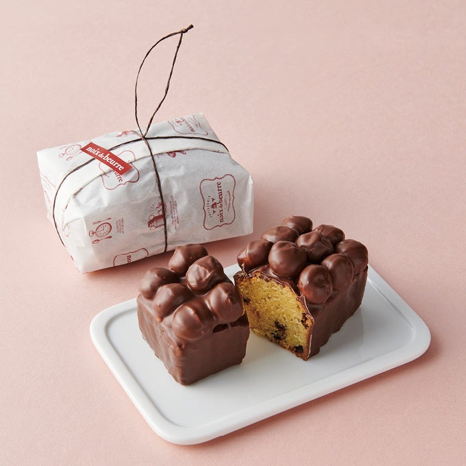アーモンドが香るチョコチップ入りのバターケーキ。ローストした香ばしいマカダミアナッツを贅沢にのせ、ミルクチョコでコーティングしました。