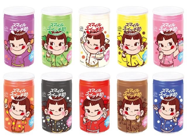 スマイルスイッチ部のオリジナルジャージを着たペコちゃんがデザインされたミルキー缶です。不二家のスイーツや飲料をモチーフにした全10種のデザインはついつい集めたくなっちゃいます。
