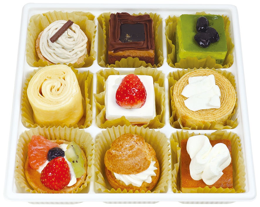 不二家洋菓子店のテレビCMに登場している今年の人気スイーツ9品をプチサイズにアレンジした思わずキュンとする可愛らしいアソートケーキです。