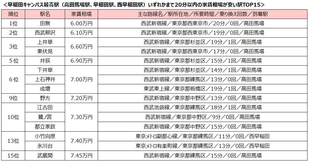 「早稲田大学」学生の一人暮らしにオススメの街2024年!早稲田キャンパス最寄り駅まで20分以内の家賃相場が安い駅ランキング