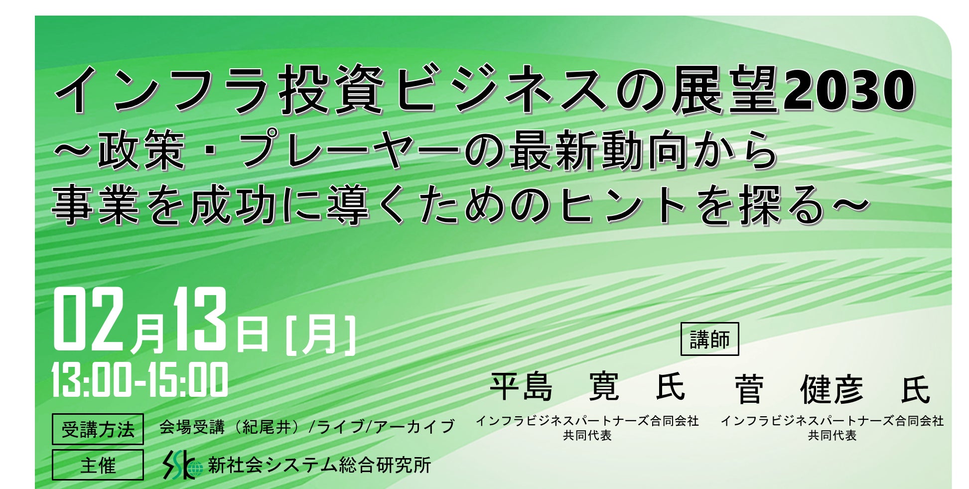 「インフラ投資ビジネスの展望2030」と題してインフラビジネスパートナーズ合同会社 共同代表 平島 寛氏 、共同代表 菅 健彦氏のセミナーを2023年2月13日(月)に開催!!
