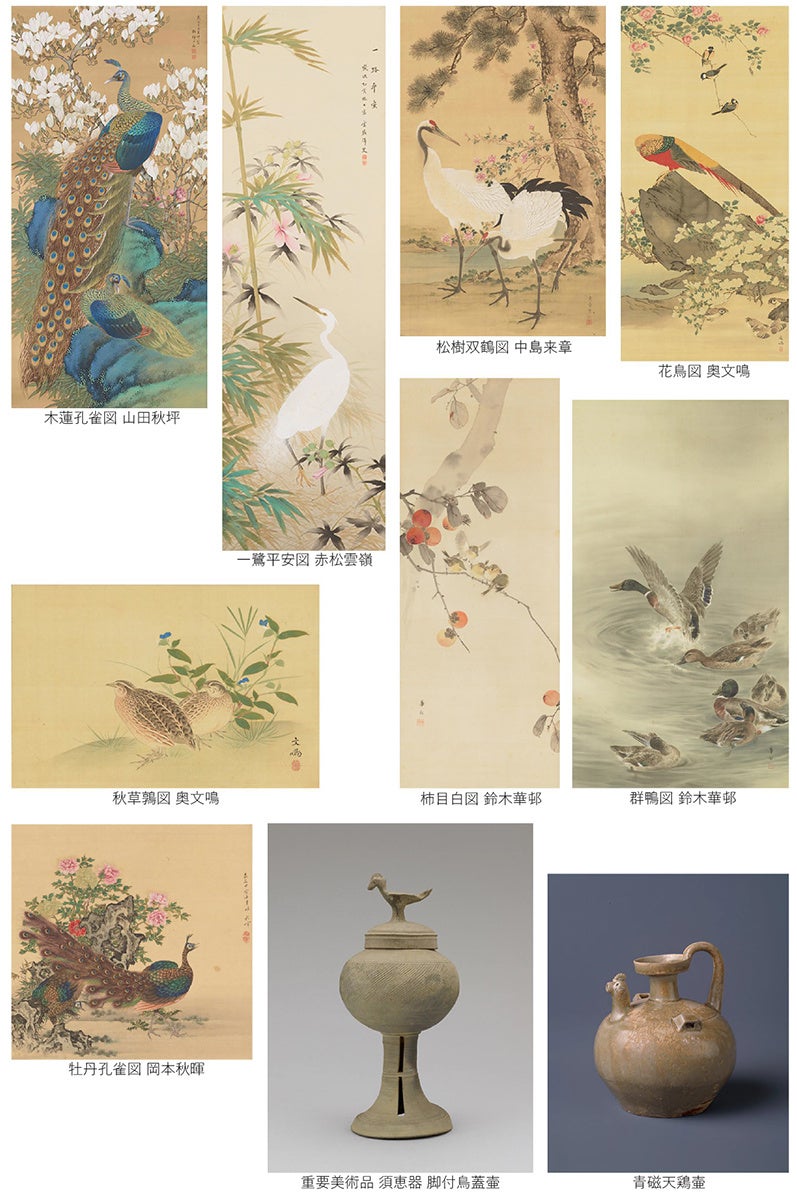 古来、多種多様な鳥類の美しい姿は画題として好まれ、花鳥画は主要な画題としての地位を確立させ、大空を飛翔する姿や水辺や野原に佇んだり、木々に留まる様子などが多くの絵画に描かれました。また、和歌や俳句などに詠まれたり、鳥をモチーフにした工芸作品も多く作られています。これは長寿や繁栄を示す幸運のシンボルであったり、また季節の移ろいを示す存在でもあるからです。