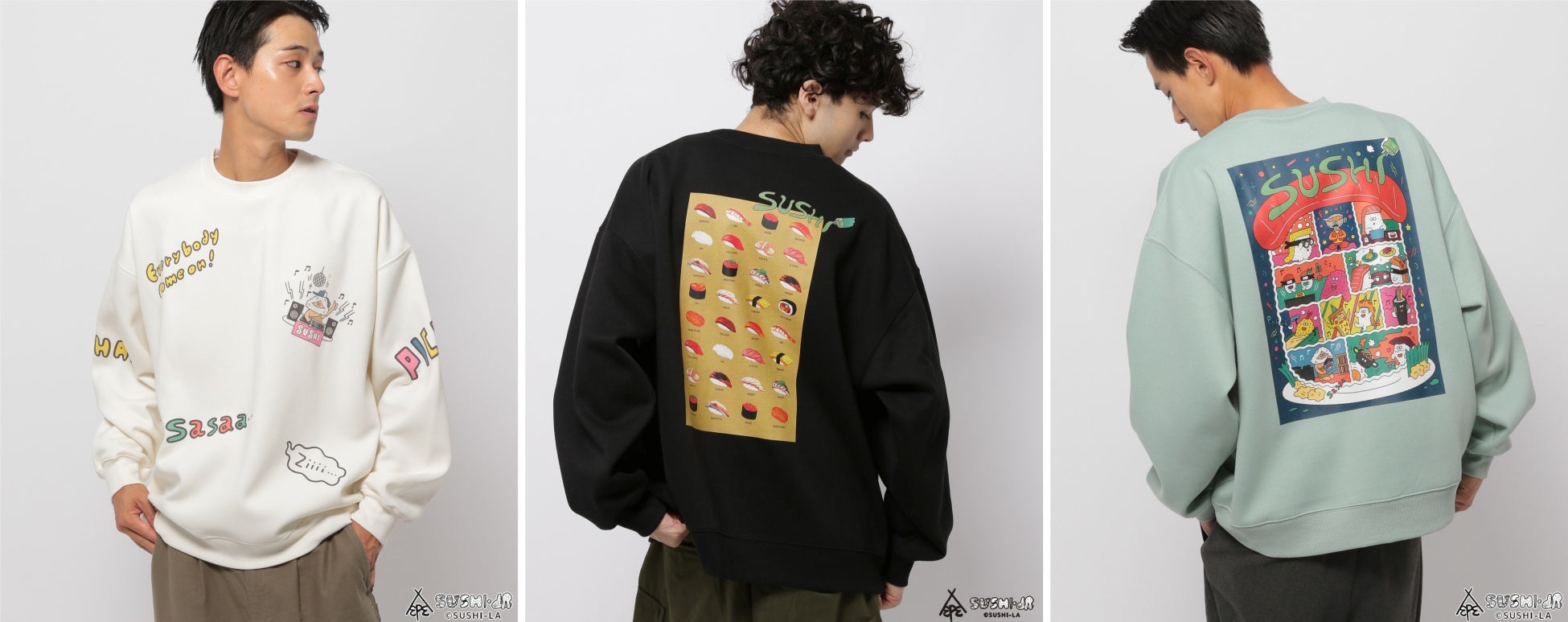 今回のコラボレーションでは ”寿司パーティー” と題して、ナカオテッペイ氏による寿司怪獣「スシエルエー」たちのユニークでかわいい書下ろしイラストに加え、オリジナルのリアルなお寿司のアートをアイテムに落とし込みました。2WAY時計やエプロンなどのインテリア雑貨から、回転寿司のお皿をイメージしたプレートやシートクッションなど日常の中でお寿司を楽しめるユニークなアイテムを豊富にラインアップ。中でも、繊細なディテールでお寿司をリアルに表現したクッション、ルームシューズ、箸置きは、実用性に加えインテリアのアクセントにもなります。生活雑貨以外にも、キャップやプルオーバーなどメンズアパレルと服飾雑貨の展開もお楽しみいただけます。