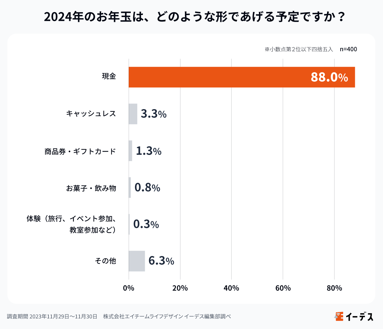 さらに、お年玉の受け渡し別で調査したところ、あげる側ともらう側のどちらもが「現金」を望んでいることがわかりました。(あげる側:88.0%、もらう側:83.3%)