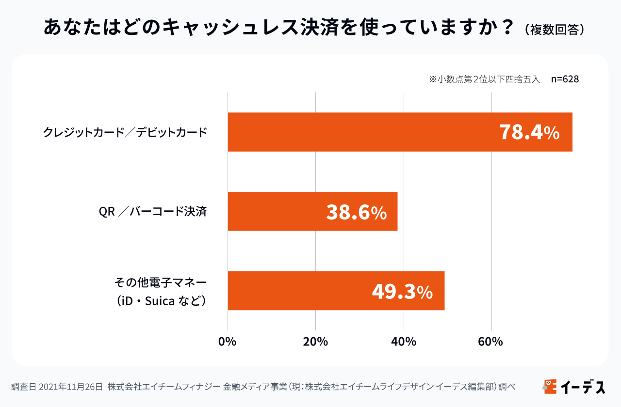 2021年11月末に実施したアンケート結果では、「クレジットカード・デビットカード(78.4%※)」が
