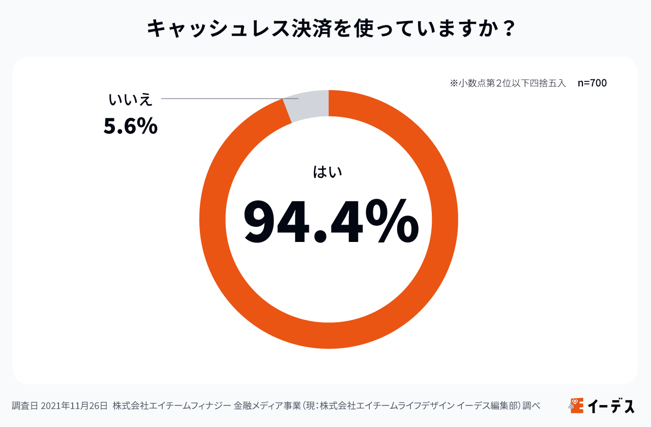 2021年11月末に実施したアンケート結果では、キャッシュレスを利用している人は94.4%※と、今回よりも約20%も多い結果となっています。