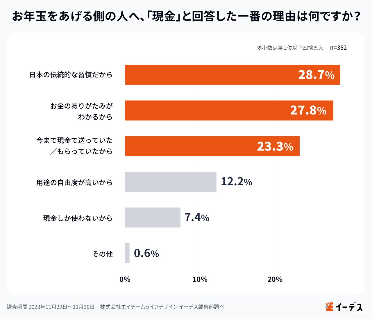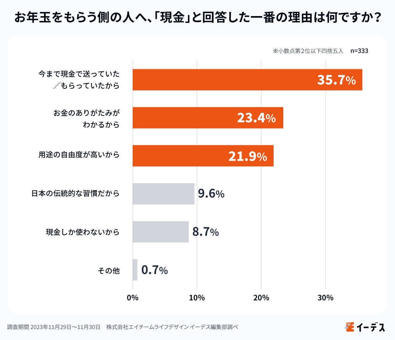 お年玉に「現金」を選んだ人に一番の理由を聞いたところ、あげる側が「日本の伝統的な習慣だから(28.7%)」で、もらう側が「今まで現金でもらっていたから(35.7%)」という結果となりました。