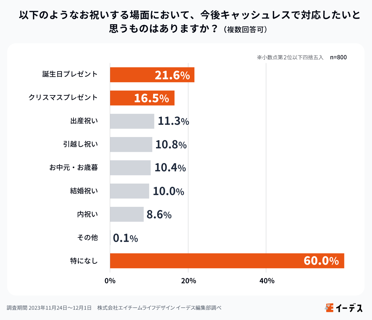 また、キャッシュレス化を望むお祝い事は「特になし(60.0%)」が大半を占める結果となったのは、"気持ち"を大切にする傾向にある日本人らしい結果なのかもしれません。