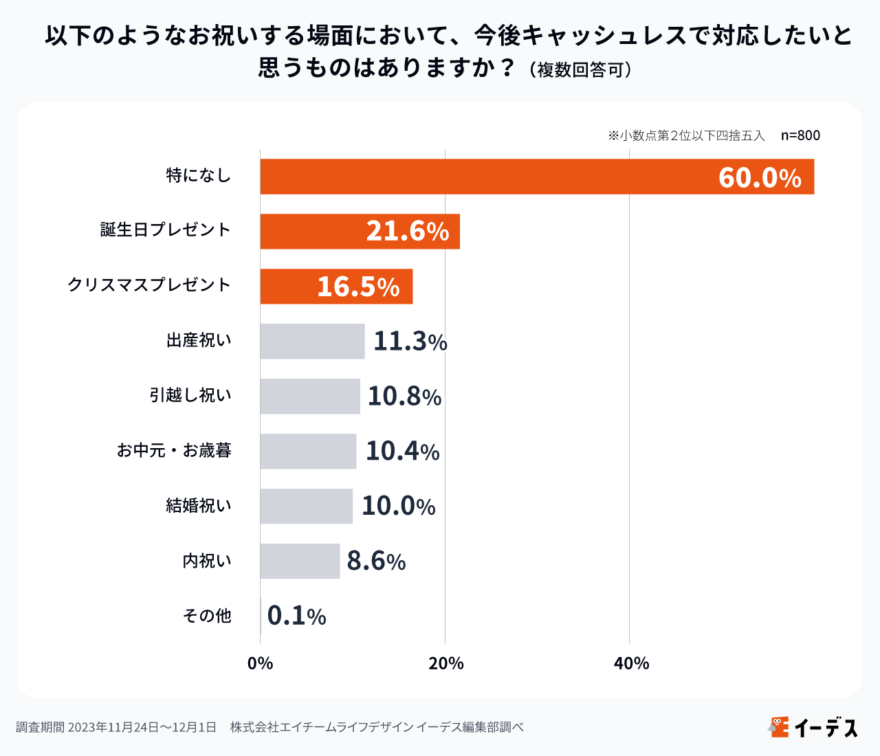 キャッシュレス化を望むお祝い事は「特になし」が60.0%を占める結果に