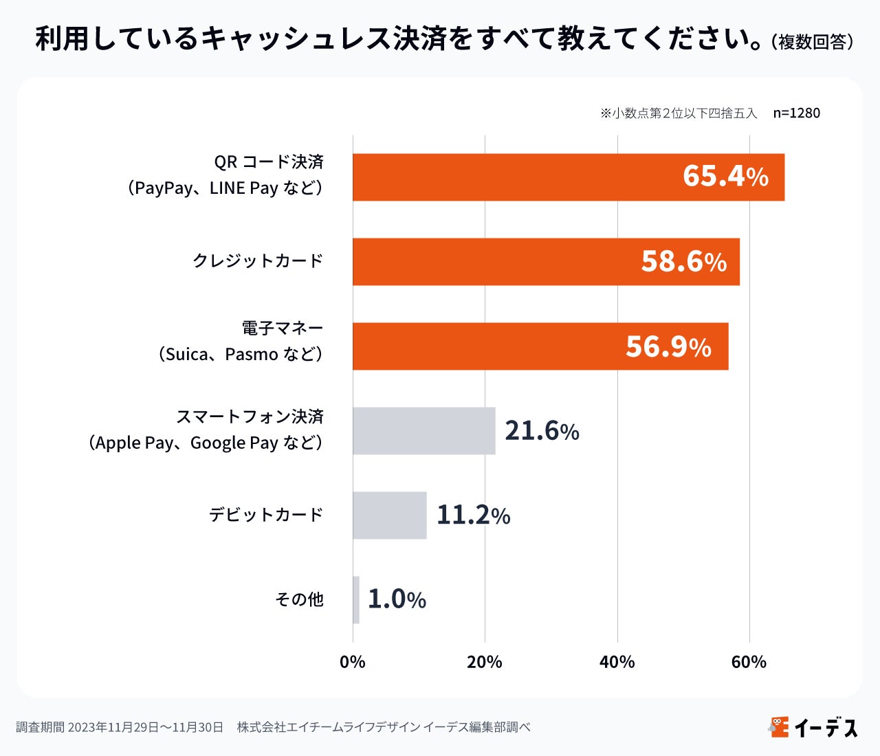 調査結果から、74.5%の人がキャッシュレス決済を利用しており、中でも「QR コード決済(65.4%)」の