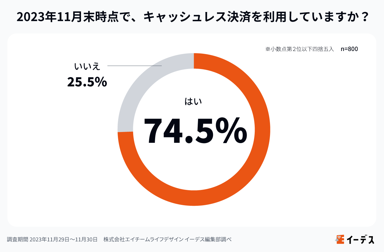 「2023年11月末時点で、キャッシュレス決済を利用していますか?」と質問したところ、「はい(74.5%)」「いいえ(25.5%)」という結果となりました。