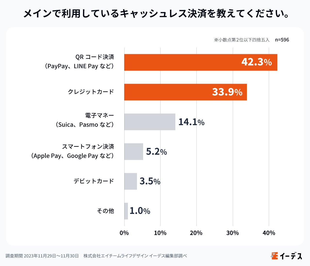 コード決済(42.3%)」が最多で、次いで「クレジットカード決済(33.9%)」と続きました。
