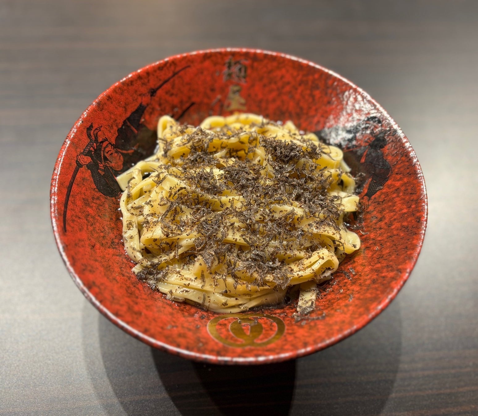 麺は平打ちの太麺を使用。あつもりで提供することで、仕上げに振りかけたトリュフの香りも引き立てます。