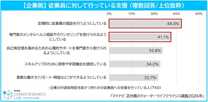 ◆企業の4割以上が従業員向けの支援として「定期的な面談」を実施