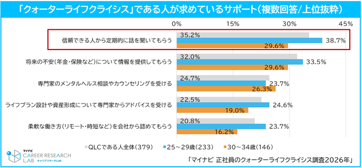 ◆「クォーターライフクライシス」である人が求めているサポートは「信頼できる人から定期的に話を聞いてもらう」
