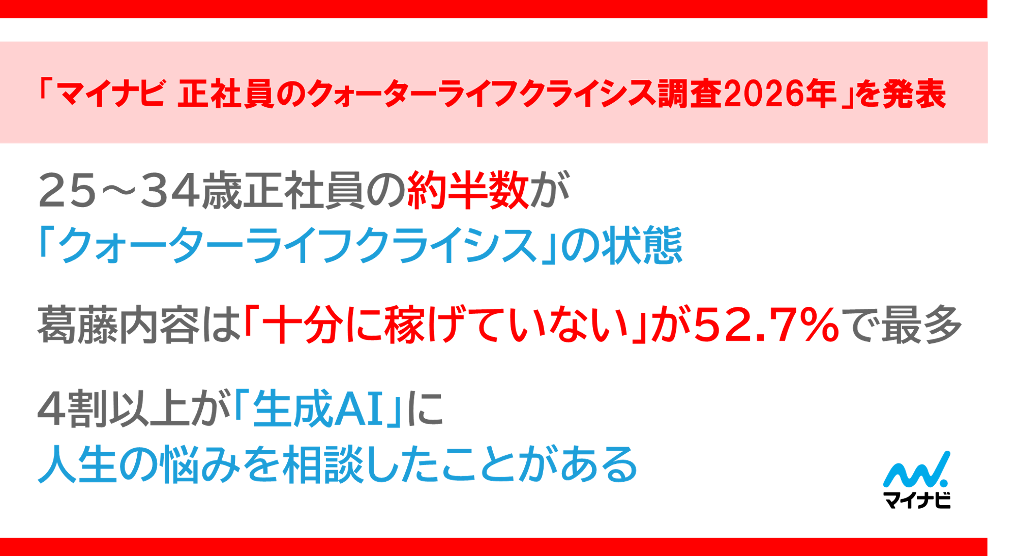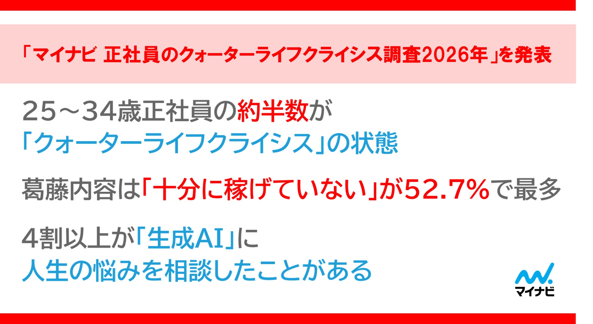 株式会社マイナビ(本社:東京都千代田区、代表取締役 社長執行役員:粟井俊介)は、25~34歳の正社員の男女と企業の中途採用担当者を対象に実施した「マイナビ 正社員のクォーターライフクライシス※調査2026年」の結果を発表しました。今回が初めての調査となります。