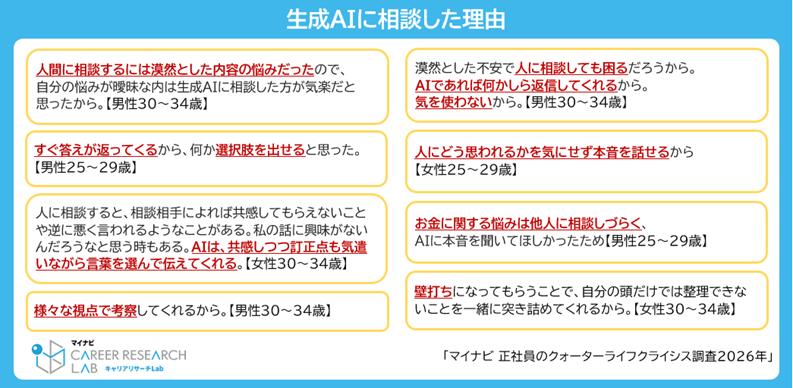 今回の調査から、25~34歳の正社員の約半数が「クォーターライフクライシス」を感じていることが明らかになりました。悩みの内容は、収入不安や今後のキャリアの方向性に関するものが中心で、特定の出来事に限らず、環境の変化や年齢の節目などが重なって生じている様子がうかがえます。また、求める支援としては「信頼できる人に話を聞いてもらう」が最多であり、悩みの解決だけでなく、気持ちや考えを整理するプロセスも重要である可能性が示唆されました。さらに、人生やキャリアの不安について生成AIに相談する人も一定数みられ、考えが整理しきれていない段階での言語化や他人に相談しづらい悩みについて本音で相談できる手段として活用されている様子もうかがえました。「クォーターライフクライシス」は、誰もが経験する可能性がありますが、必ずしも“乗り越えなければならないもの”ではありません。人との対話や企業による支援、生成AIへの相談といった多様な選択肢を状況に応じて使い分けながら、悩みとうまく付き合っていくことのできる環境づくりが、今後ますます重要になるのではないでしょうか。