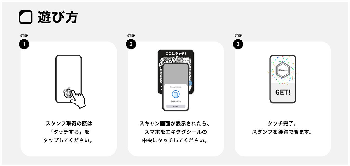 駅などに設置された専用のNFCタグにスマートフォンをタッチすることで、設置場所ごとに違うスタンプをアプリ内のデジタルスタンプ帳で収集することができるアプリサービスです。
