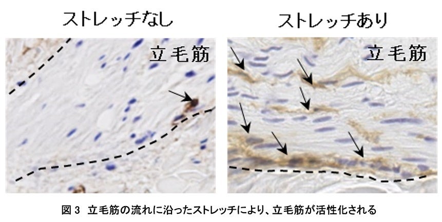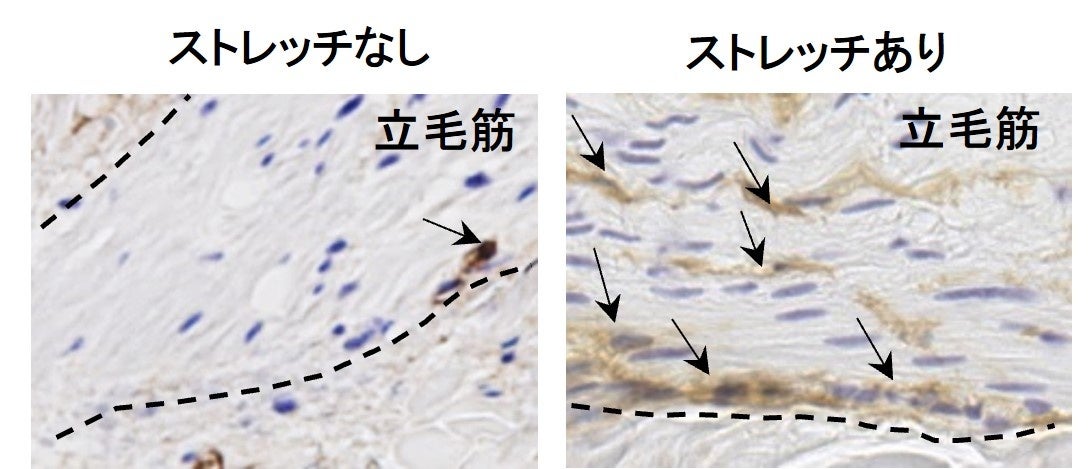皮ふの断面像。点線に挟まれた部分 (右図では点線より上の部分)が立毛筋。皮ふを立毛筋の向きに合わせて伸展(ストレッチ)することで、活性化した状態が誘導された(右図;矢印の増加)。青い点は細胞(核)。