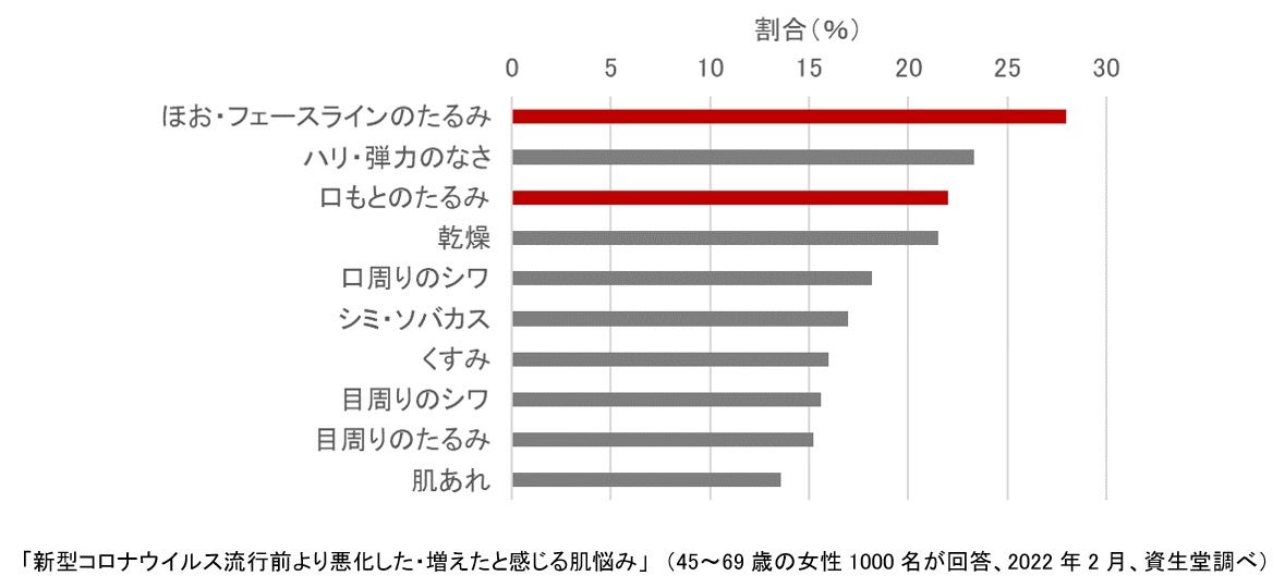 2023年5月より、COVID-19の感染症としての分類が変更になり、屋外生活を中心に、マスク着用ルールが緩和されている日本。資生堂では、45~69歳の女性1000名を対象とし、「新型コロナウイルス流行前より悪化した・増えたと感じる肌悩み」について調査を実施しました。その結果、1位は「ほお・フェースラインのたるみ」(28%)であり、また、3位には「口もとのたるみ」(22%)がランクインしていました。マスク生活による顔の下半分の「たるみ」に悩む生活者の多さが伺えます。