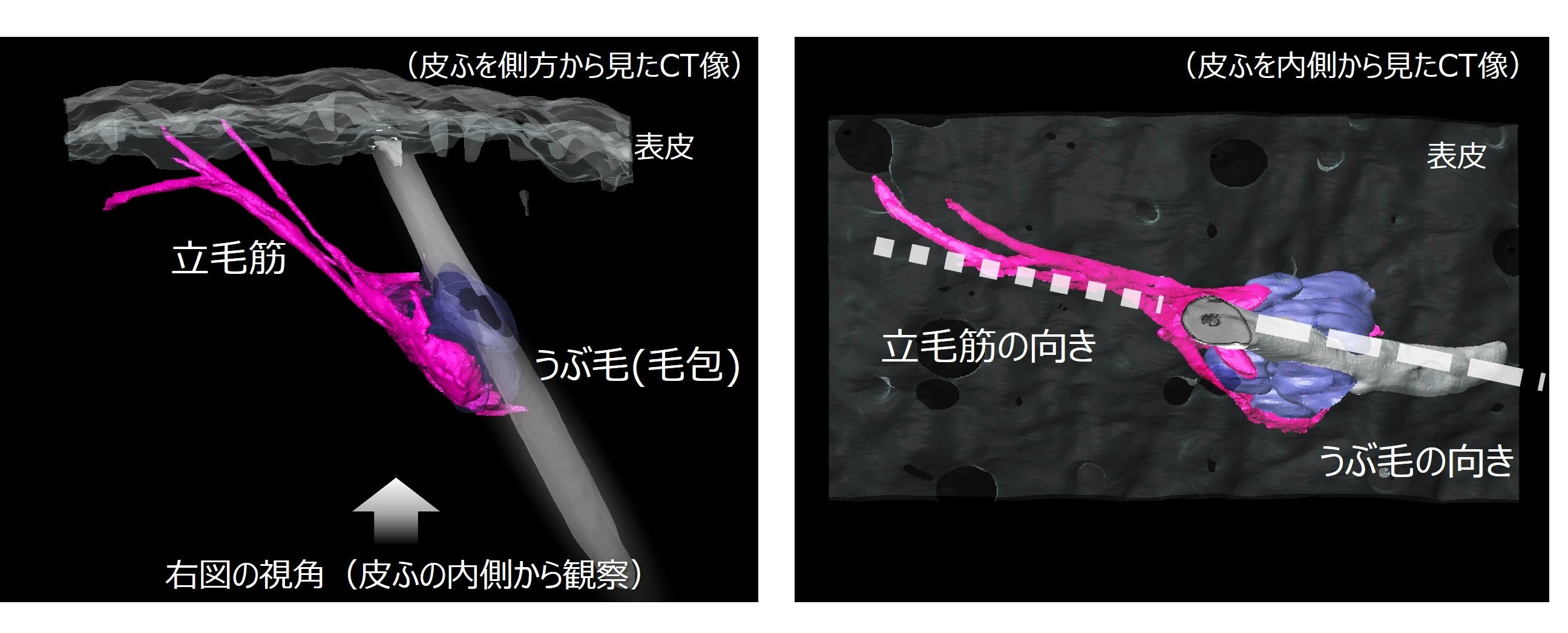 左) 皮ふを側方から見たCT像。ピンク色の部分が立毛筋、グレーの棒状の構造がうぶ毛の毛包。これを下側、即ち皮ふの内側から観察(矢印)した画像が右図となる。右) 皮ふを内側から見たCT像。一番奥に見えるのが表皮の内側。点線で、立毛筋とうぶ毛の向きを表示。その向きはほぼ一致することがわかる。