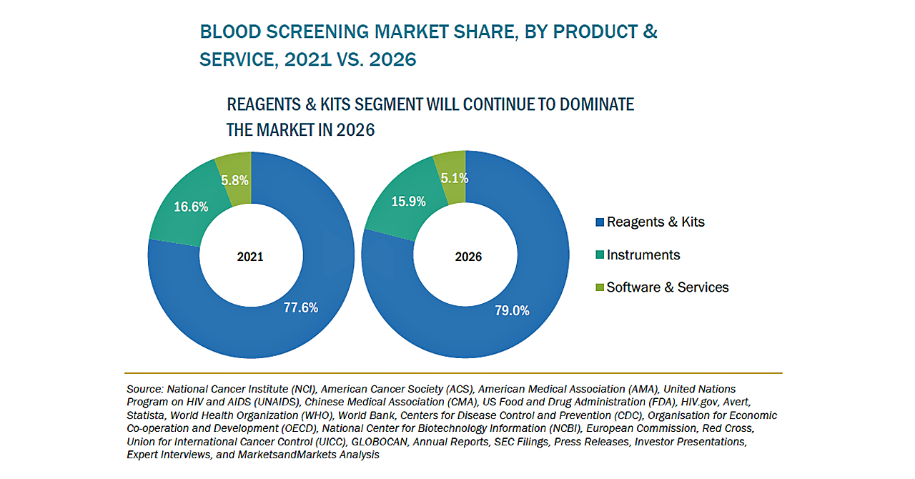 血液スクリーニングの市場規模は、2021年の25億米ドルからCAGR8.4%で成長し、2026年には38億米ドルに達すると予測されています。市場成長の背景には、献血需要の高まり、世界各地での献血件数の増加、感染症の流行などがあります。