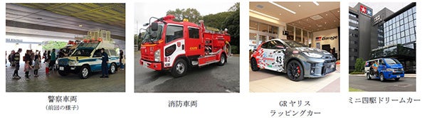 警察車両、消防車、GRヤリスの展示用ラッピングカー、ミニ四駆ドリームカー、阪神甲子園球場で活躍しているリリーフカーやグラウンド整備車両の実車展示を行います!