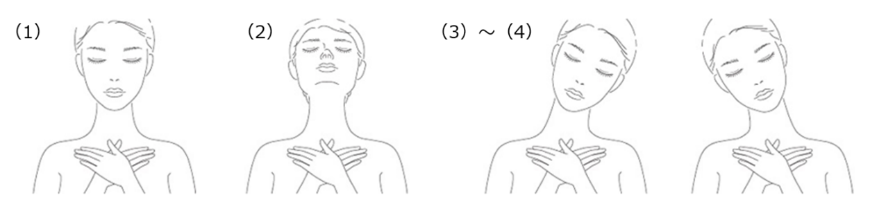 (2) 下に引っ張りながら口を閉じたまま顔を上に向け、首を伸ばし、5秒キープします。