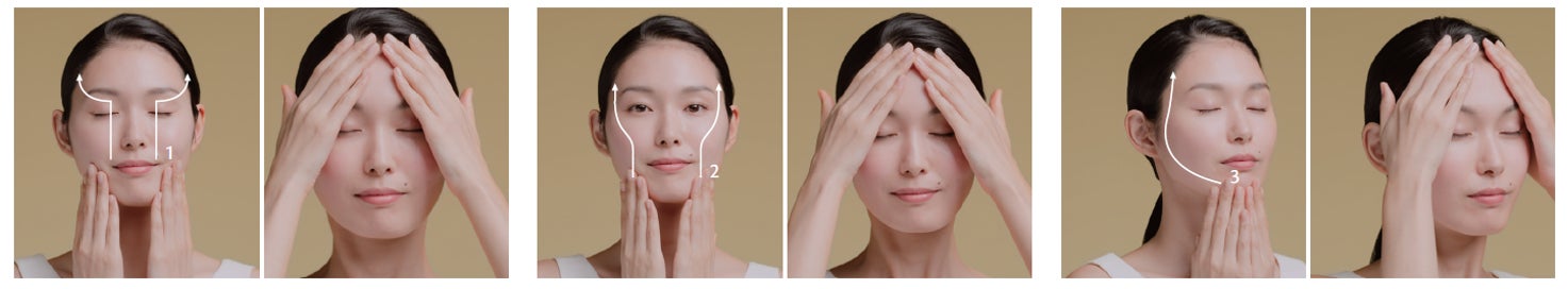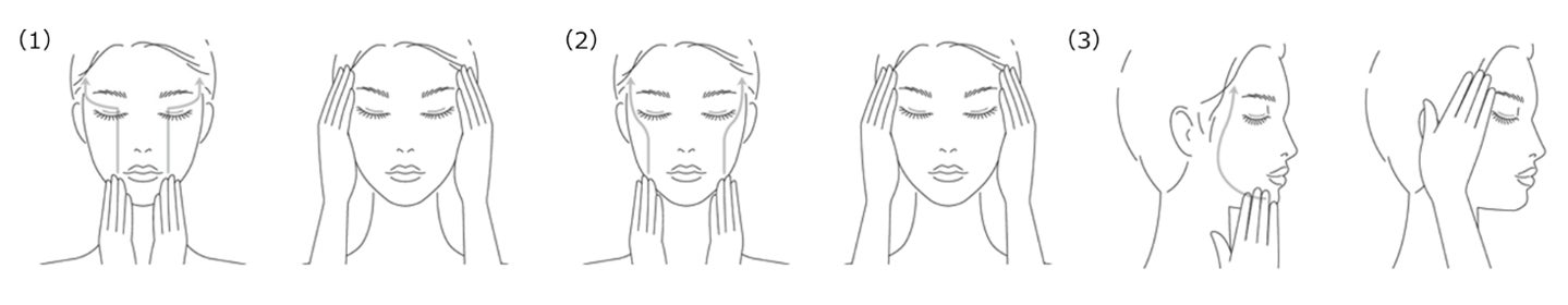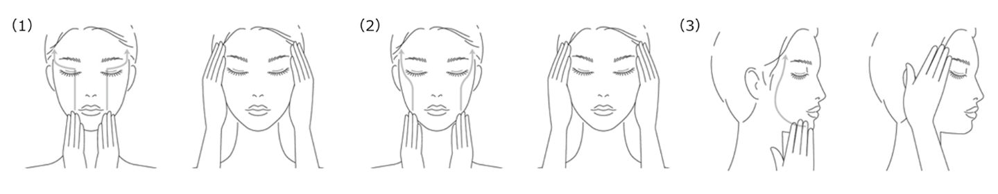 (3) あご先からフェイスライン、こめかみを通って軽く引き上げ、肌の表面を伸ばしながら5秒キープします。
