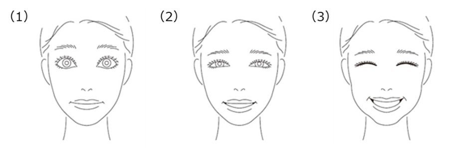 (1) 目を見開きながら、口角を強く横に引き、5秒キープします。