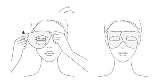 (2)マスクのまぶたの部分を外側にたおして、▼部分がこめかみ側にくるように持ち、ミシン目を目の下に合わせて肌に貼ります。