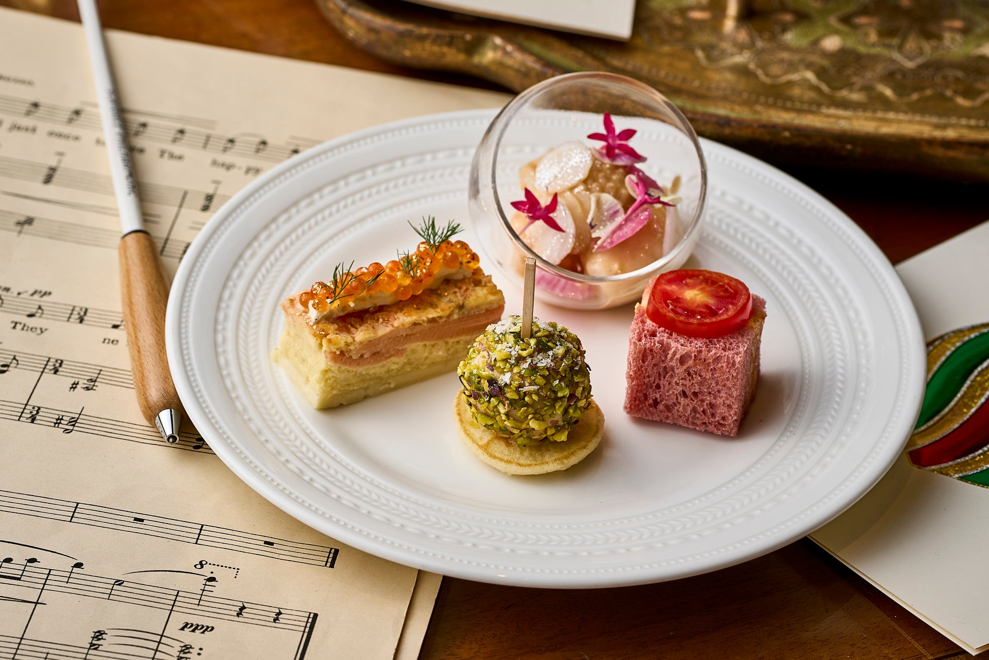 優雅な雰囲気漂う1階「ザ・ロビーラウンジ」では、エグゼクティブペストリーシェフ フレデリック・モローとバンケットシェフ 片山泰宏による、ホリデーシーズンのための華やかなアフタヌーンティーをご用意いたします。今回は様々な種類のチョコレートの味わいの違いをお楽しみ頂くため、ダークチョコレート、ミルクチョコレート、ホワイトチョコレート、キャラメライズチョコレート、そして希少なココアパルプ※の5種を使用。それぞれの味わいを活かしたスイーツで、まるで五重奏のように調和する“クリスマスシンフォニー”を表現しました。素材ごとの風味の違いをお楽しみいただきながら、チョコレートの奥深い世界をご堪能ください。セイヴォリーでは、魚介の旨味がたっぷり詰まった濃厚なビスクソースをあわせた「エビとイカのサラダ ビスクソース」や、「フォアグラムース ダークチェリーとピスタチオ」など、見た目も華やかでクリスマスにふさわしいお料理をご用意いたしました。