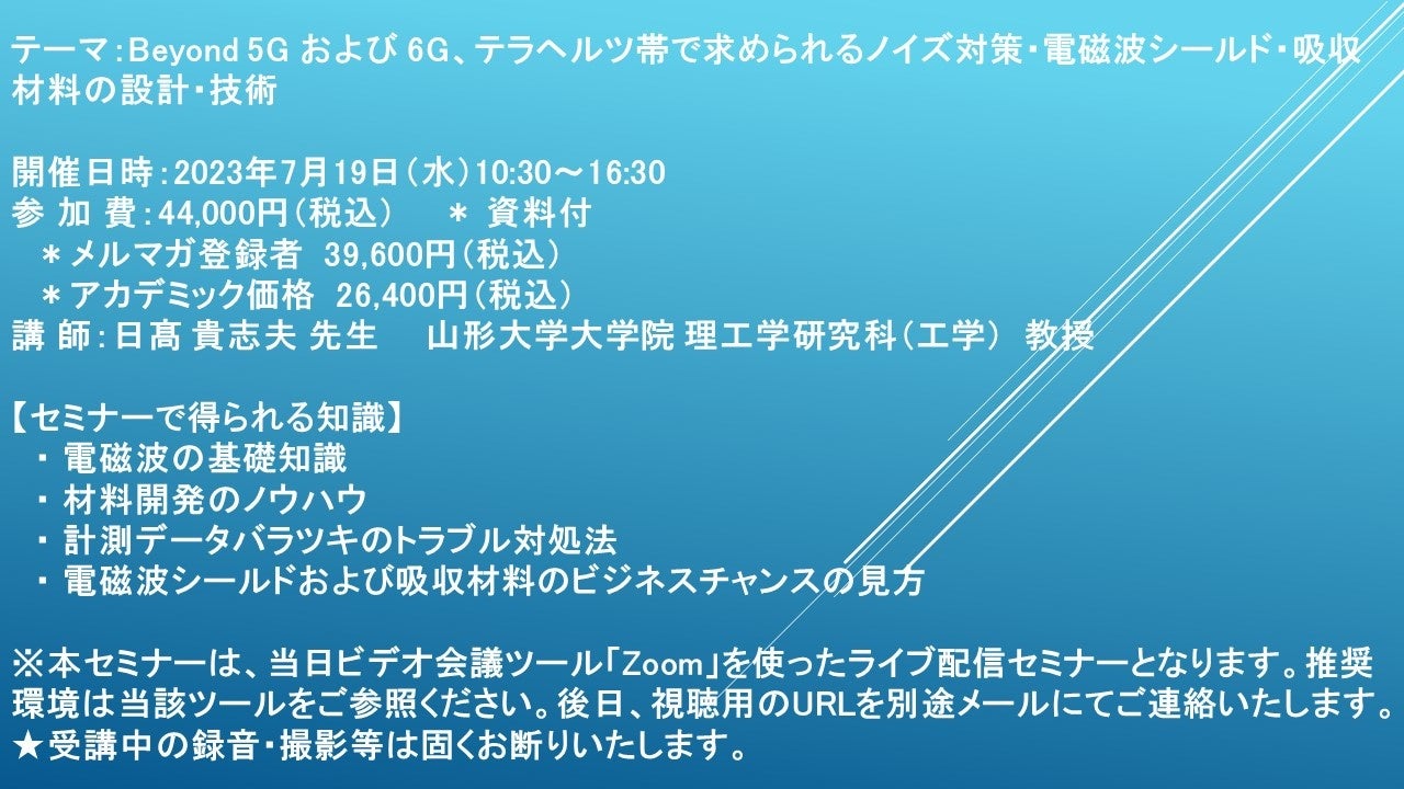 【ライブ配信セミナー】Beyond 5G および 6G、テラヘルツ帯で求められるノイズ対策・電磁波シールド・吸収材料の設計・技術 7月19日(水)開催 主催:(株)シーエムシー・リサーチ