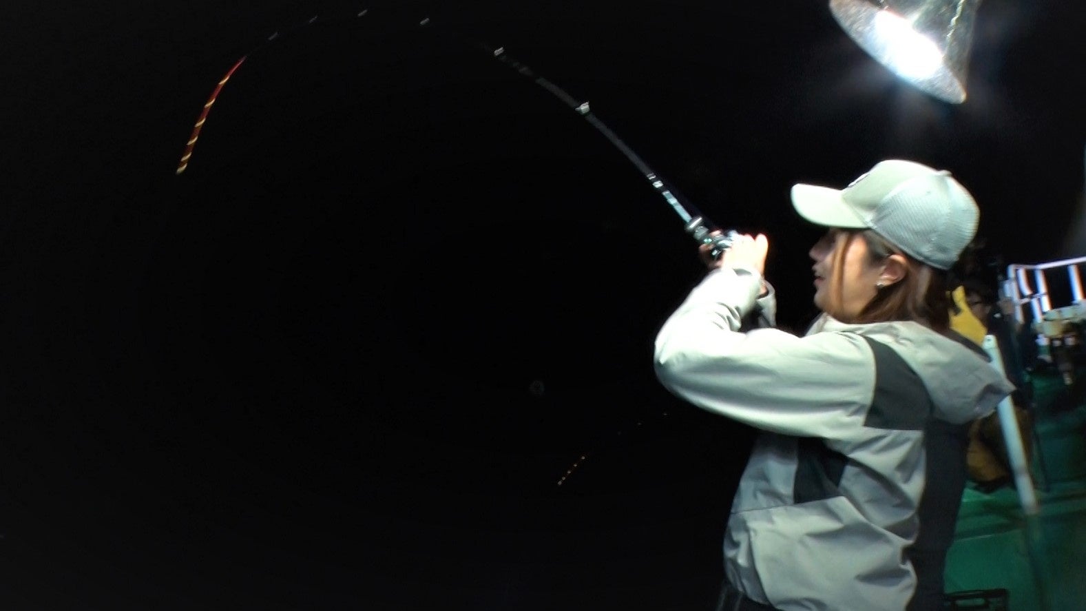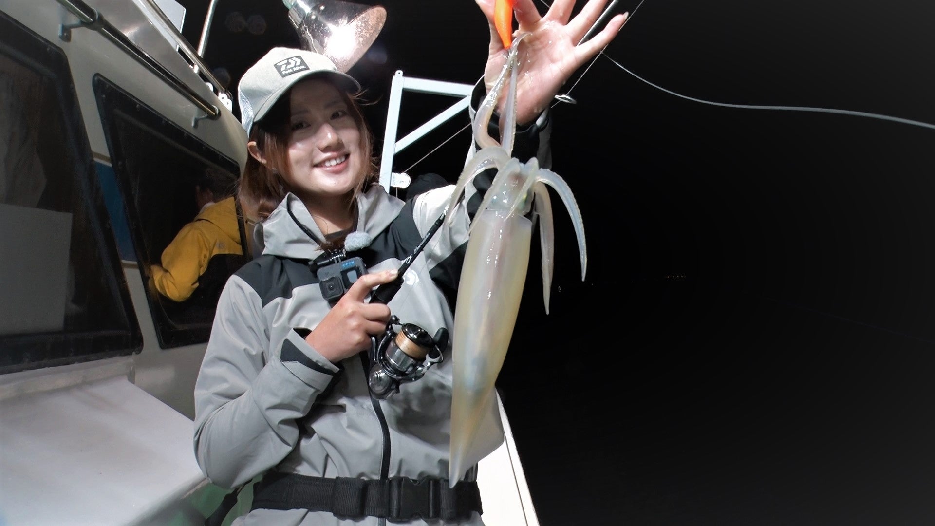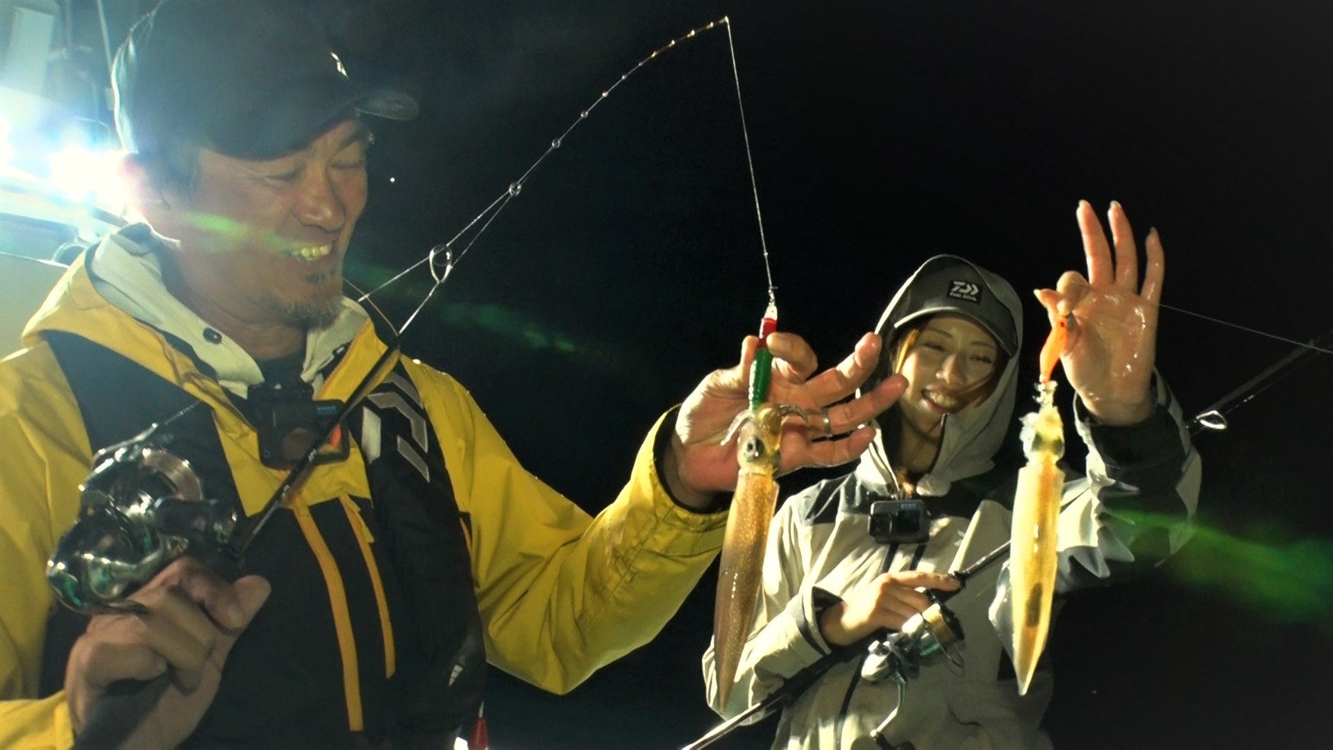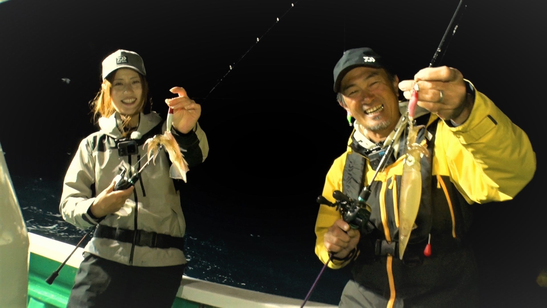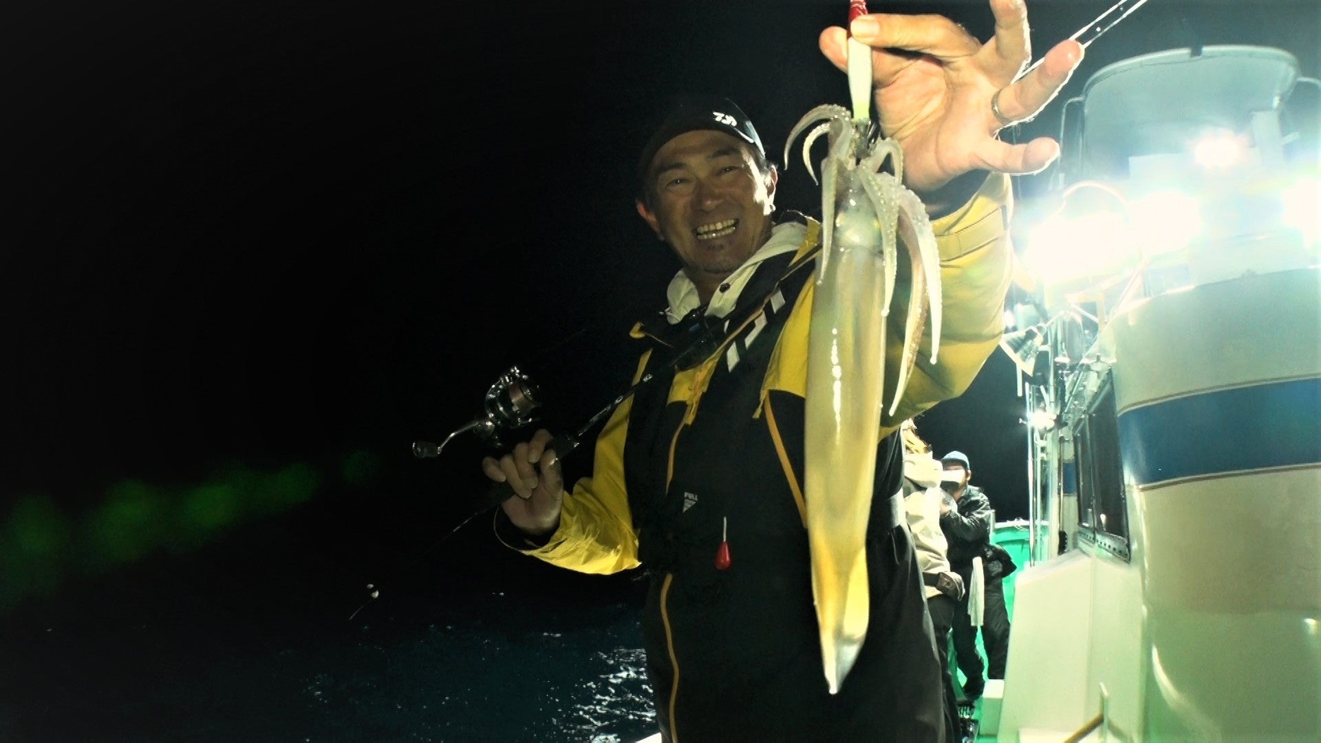 と、今度は光安にきた!「このイカの引き、たまんない」と、イカとのやりとりを堪能して、光安もスルメイカをキャッチ!