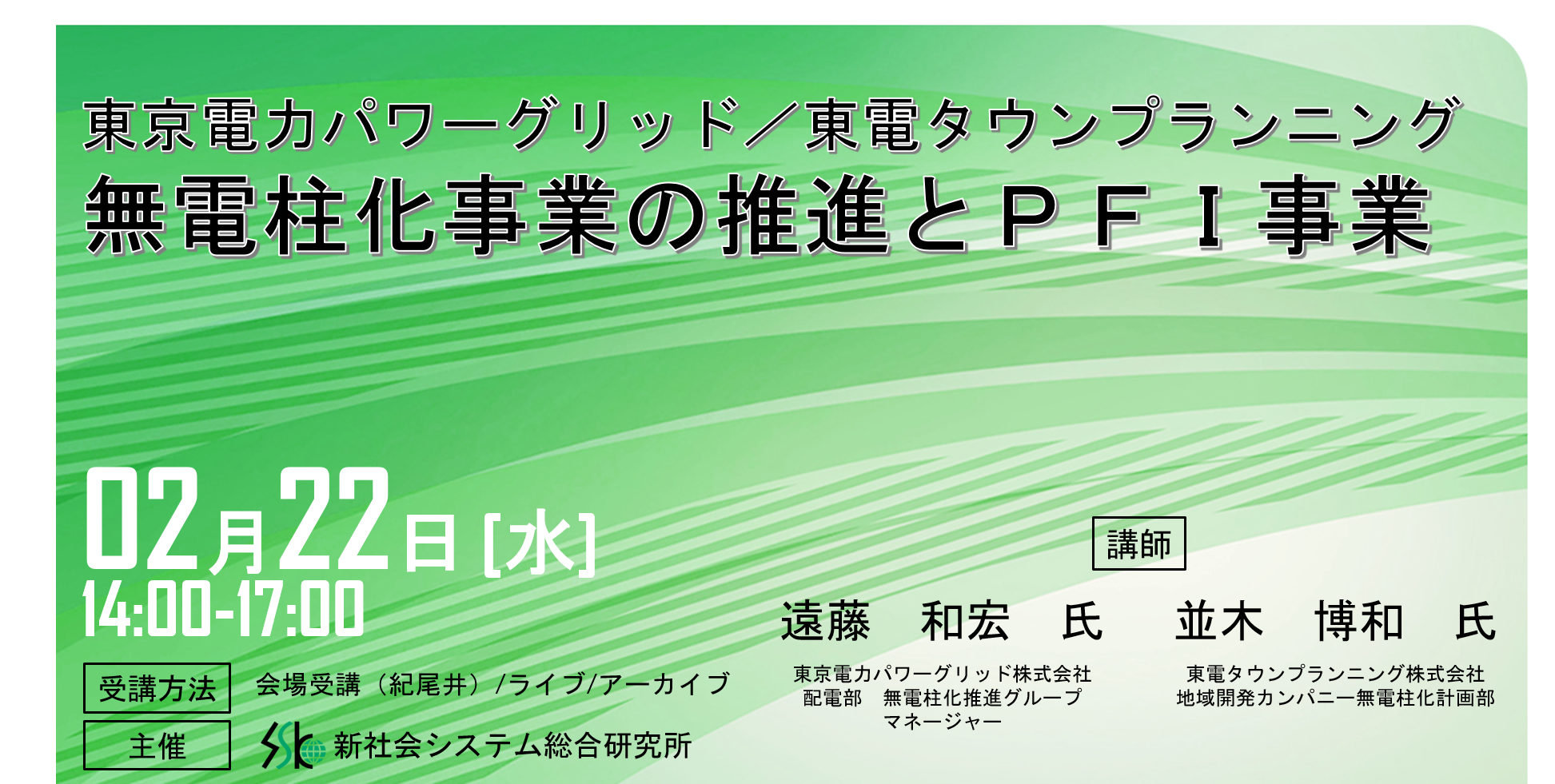「無電柱化事業の推進とPFI事業」と題して 東京電力パワーグリッド株式会社 遠藤 和宏氏、東電タウンプランニング株式会社 並木 博和氏のセミナーを2023年2月22日(水)に開催!!