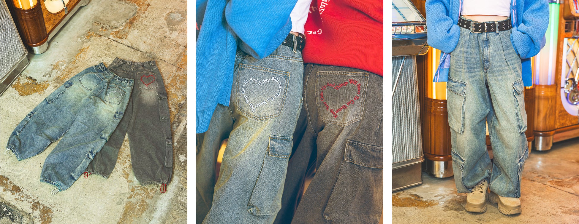 トレンド感のあるシルエットに、ポケットにはハートの刺繍でアクセントを加えたデニム。