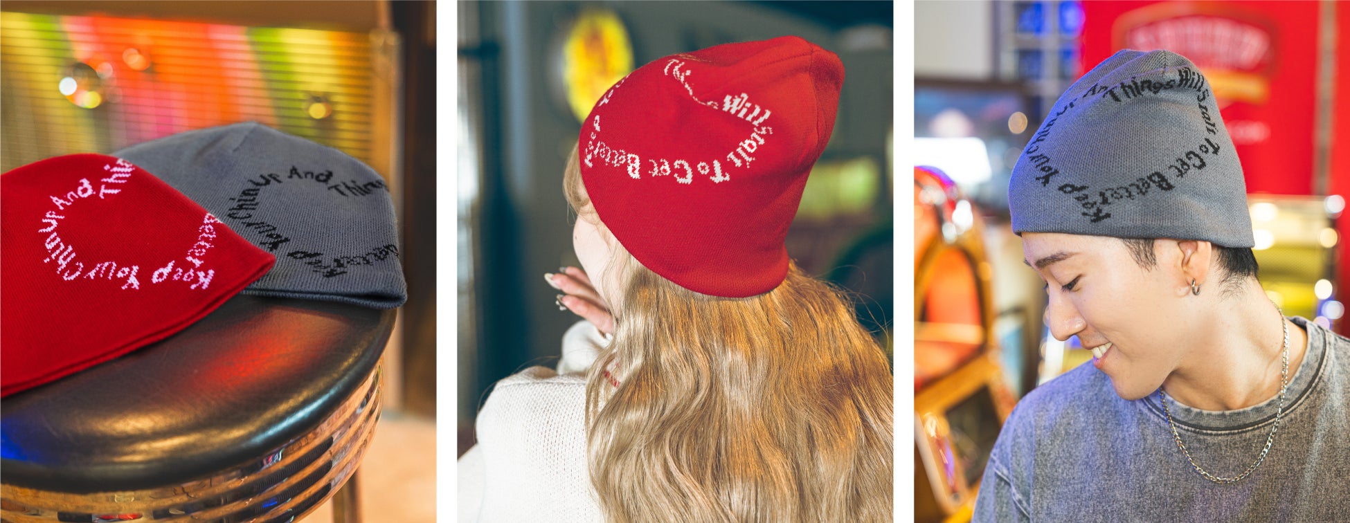 大きなハートの織りデザインがコーデのアクセントになるビーニー。