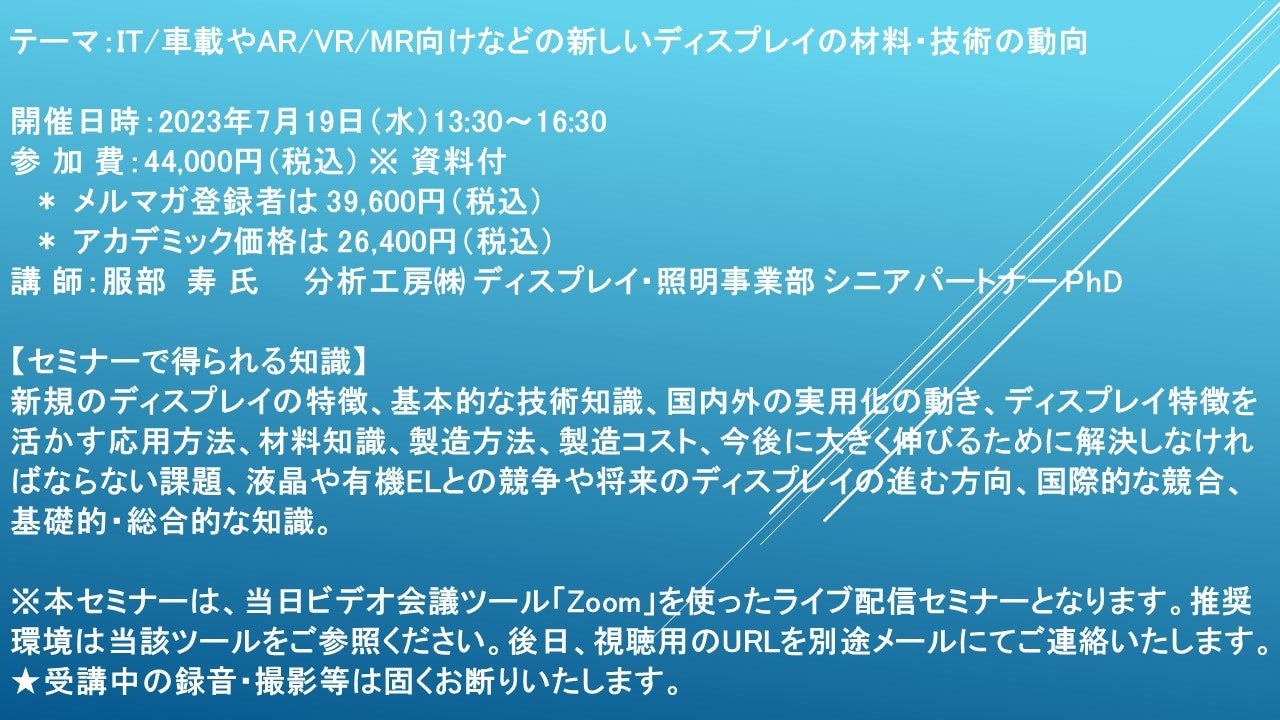 【ライブ配信セミナー】IT/車載やAR/VR/MR向けなどの新しいディスプレイの材料・技術の動向 7月19日(水)開催 主催:(株)シーエムシー・リサーチ